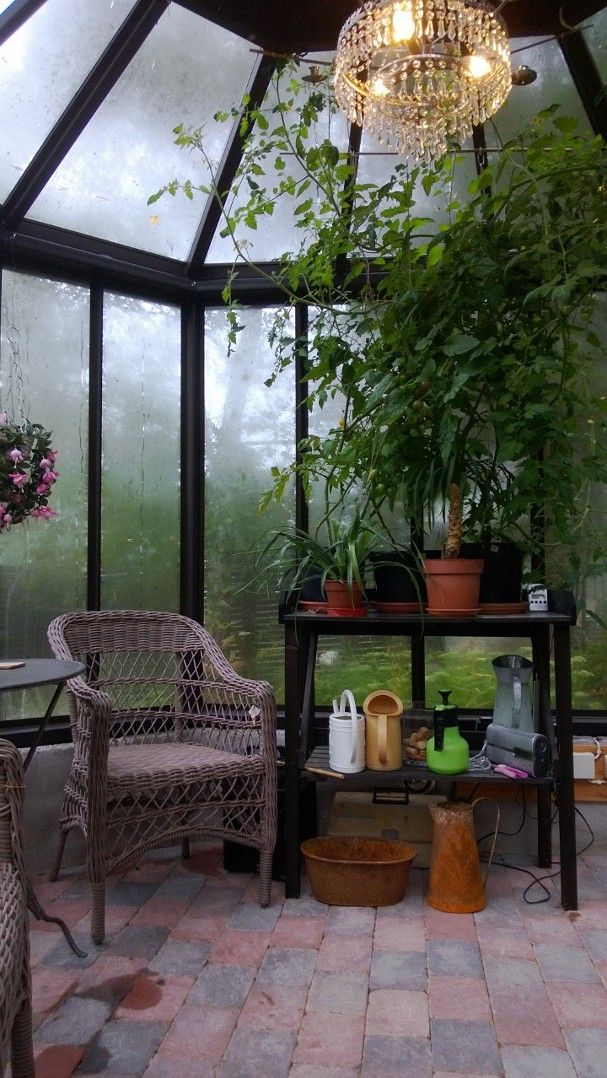 Sateen sattuessa Rosenbladit voivat istahtaa suojaan vaikkapa tähän pieneen kasvihuoneeseen. Sinne saa lämpöäkin ja mikäs sen mukavampaa kuin kuunnella sateenropinaa kattoa vasten.