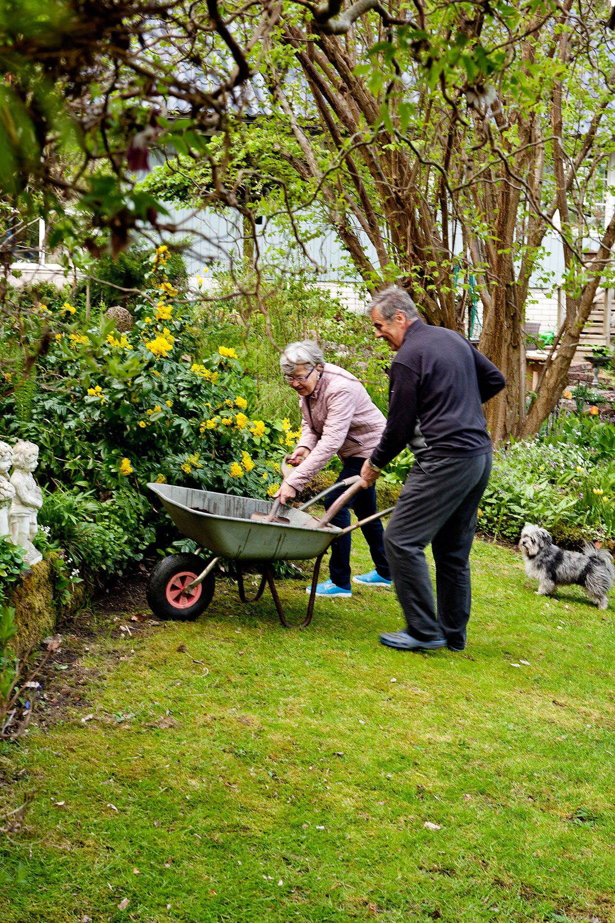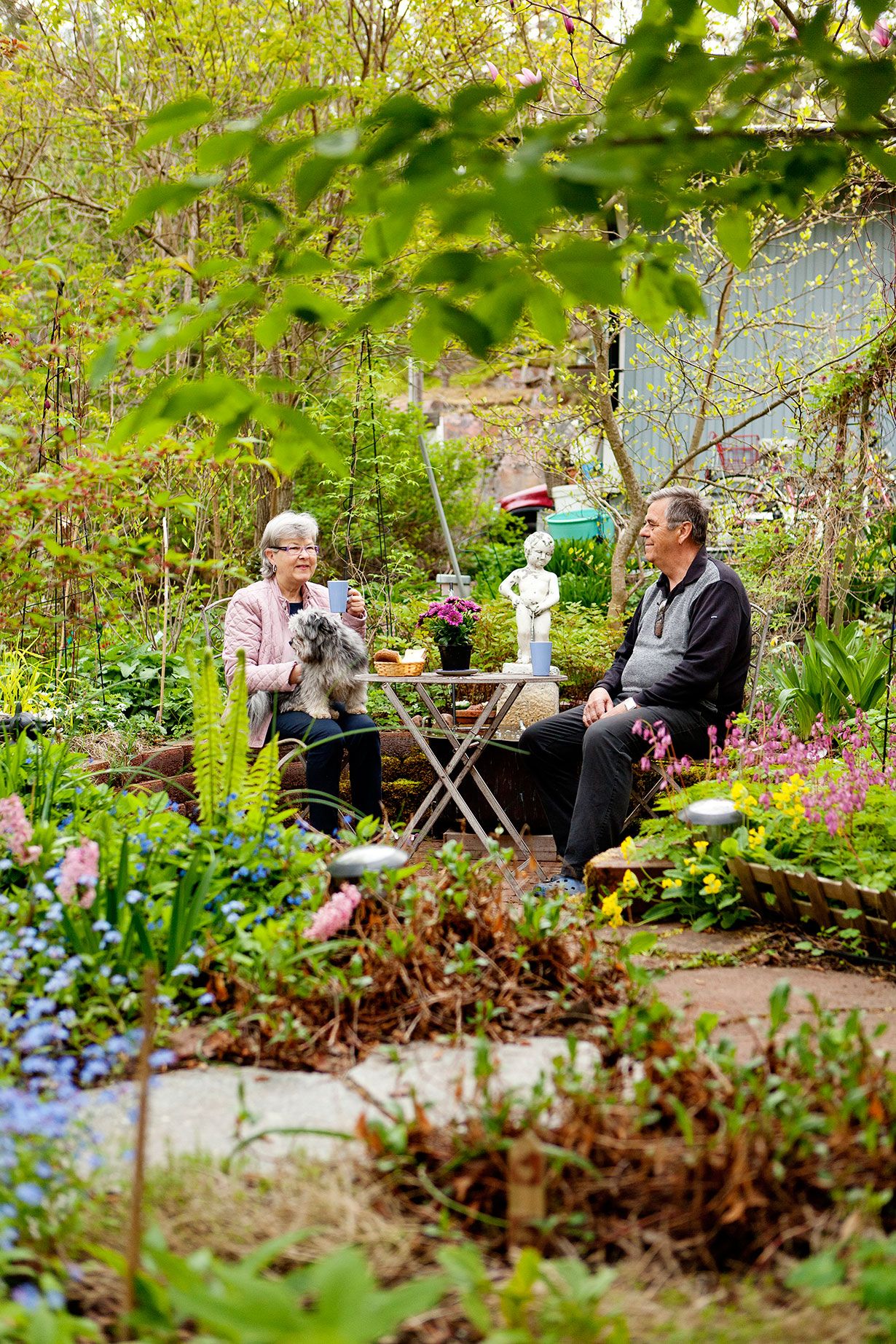 Clas hoitaa puut, pensaat, kivet ja kastelun, Britt-Mari paneutuu perennoihin, rikkaruohojen kitkemiseen ja kompostointiin