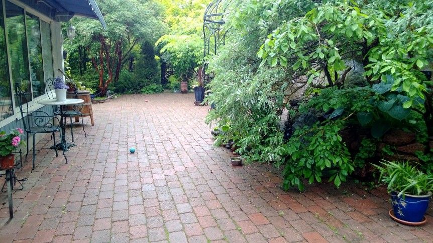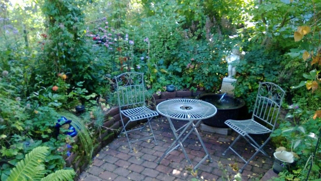 Tässä on yksi tontin harvoista tasaisista paikoista. Pöytäryhmästä voi ihailla pientä vesiputousta: