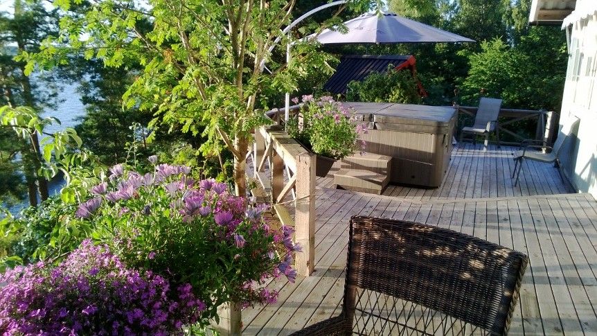 Tämä terassi on Rosenbladien suosikkipaikka kesällä. Siinä syödään ja loikoillaan porealtaassa. Näkymä terassilta on Maarianhaminaan asti ja ohi kulkee paljon veneitä, joita on hauska seurata.