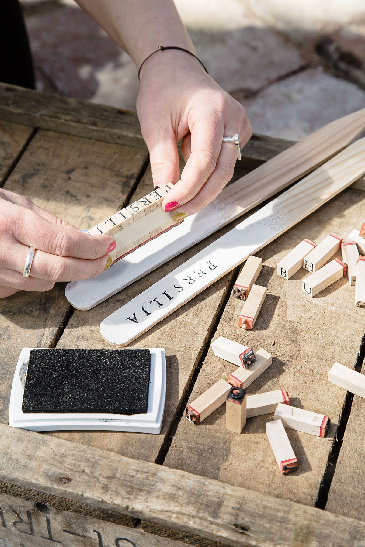 - Paina leimasin tasaisesti tikun pintaan. Ota lisää väriä mustetyynystä ja paina seuraava nimikyltti. Teksti kestää paremmin, kun sivelet päälle kirkkaan lakan.