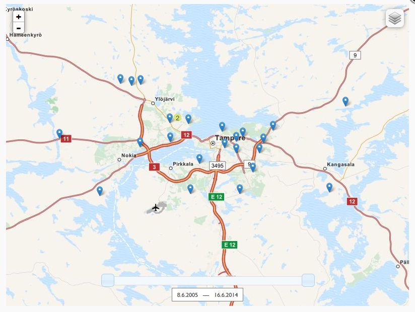 Voit myös tutkia, onko lähiseudullasi vieraslajeja. Yksityiskohtainen kartta esimerkiksi Tampereen seudun jättiputkihavainnoista näyttää tältä: