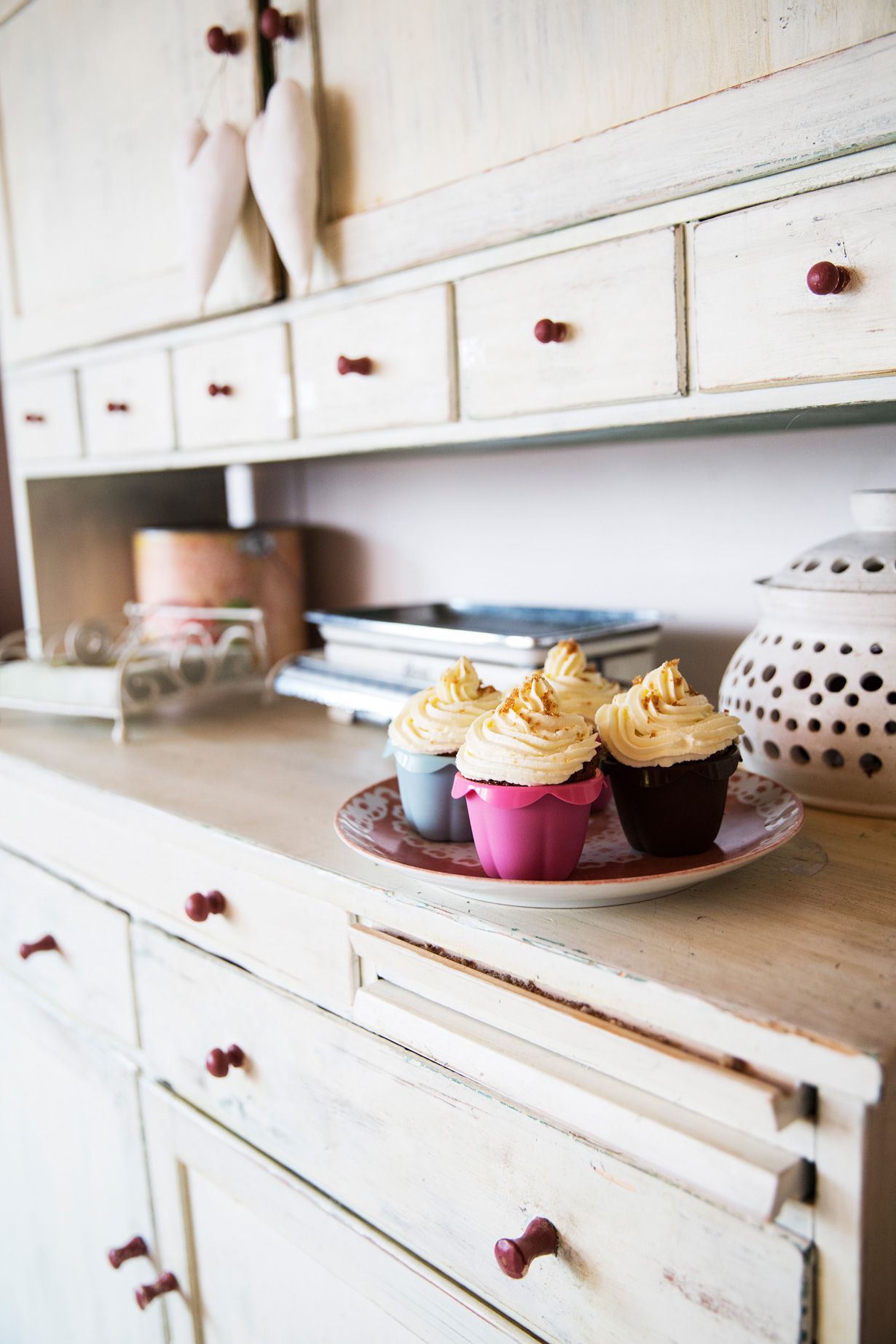 5. Vatkaa tuorejuusto, pehmeä voi ja tomusokeri keskenään ja lisää ranskankerma. Pursota muffinien päälle ja koristele fariinisokerilla tai pähkinärouheella.