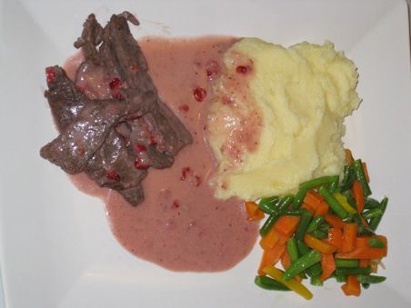 Naudanpaisti oli erittäin mureaa ja puolukkakastike maukasta. Maalaiskasvikset sopivat hyvin annokseen. Annoksesta tuli lisäksi yllättävän kaunis!