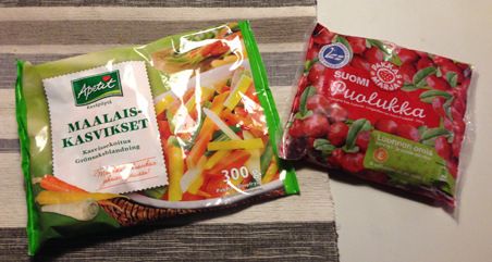 Maalaiskasvikset ja puolukat olivat pakasteita. Kaikki pakasteet olivat jäässä, mutta sen verran sulia, että niitä ei voinut enää laittaa pakastimeen. Hyvin ne säilyivät kuitenkin kolme päivää jääkaapissa.