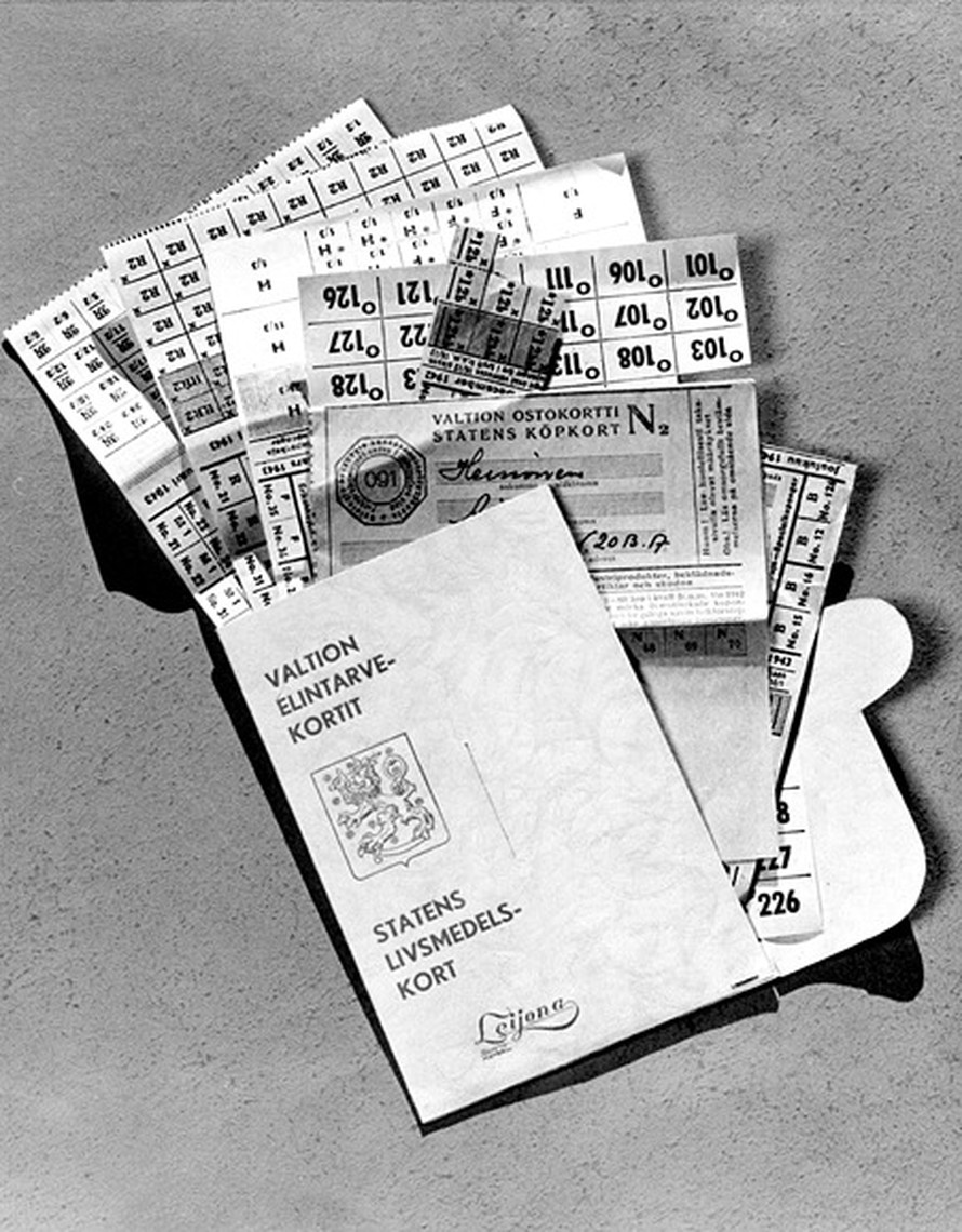 Elämä Suomessa oli kontrolloitua ja säännösteltyä. Kaikesta oli ilmoitettava ja tehtävä tili. Oli haettava lupa kaikkiin tekemisiin.Kuukausittain saatiin uudet, kolme eriväristä ostokorttia. Niistä kauppias leikkeli kuponkeja ostosten yhteydessä tarpeen mukaan. Asiakkaat valittivat, että korttiannokset olivat pieniä. Vielä aikuisenakaan en ymmärrä, mikä tai kuka oli ”mustapörssi” ja mistä se sai tavaraa varastoonsa.