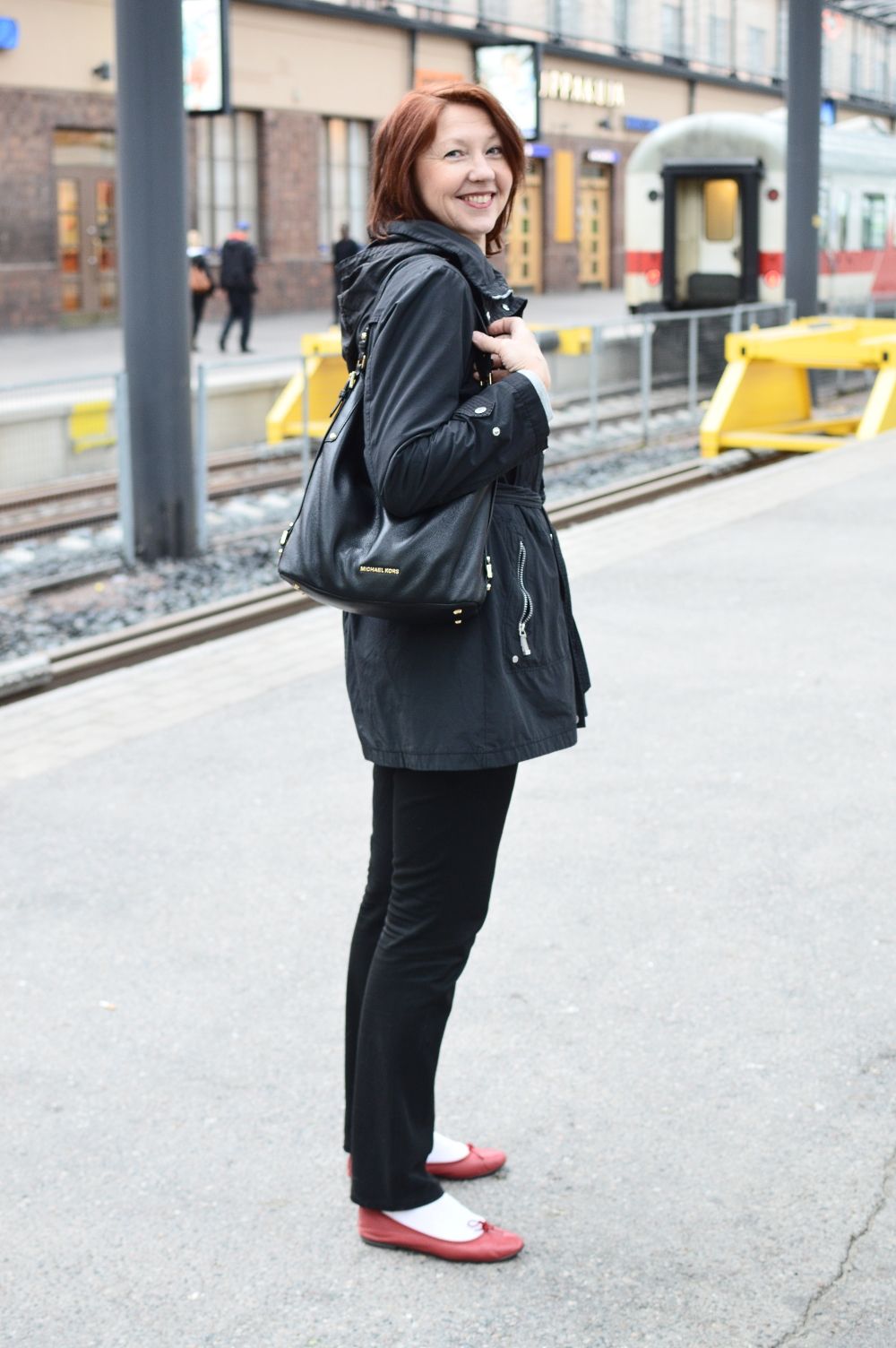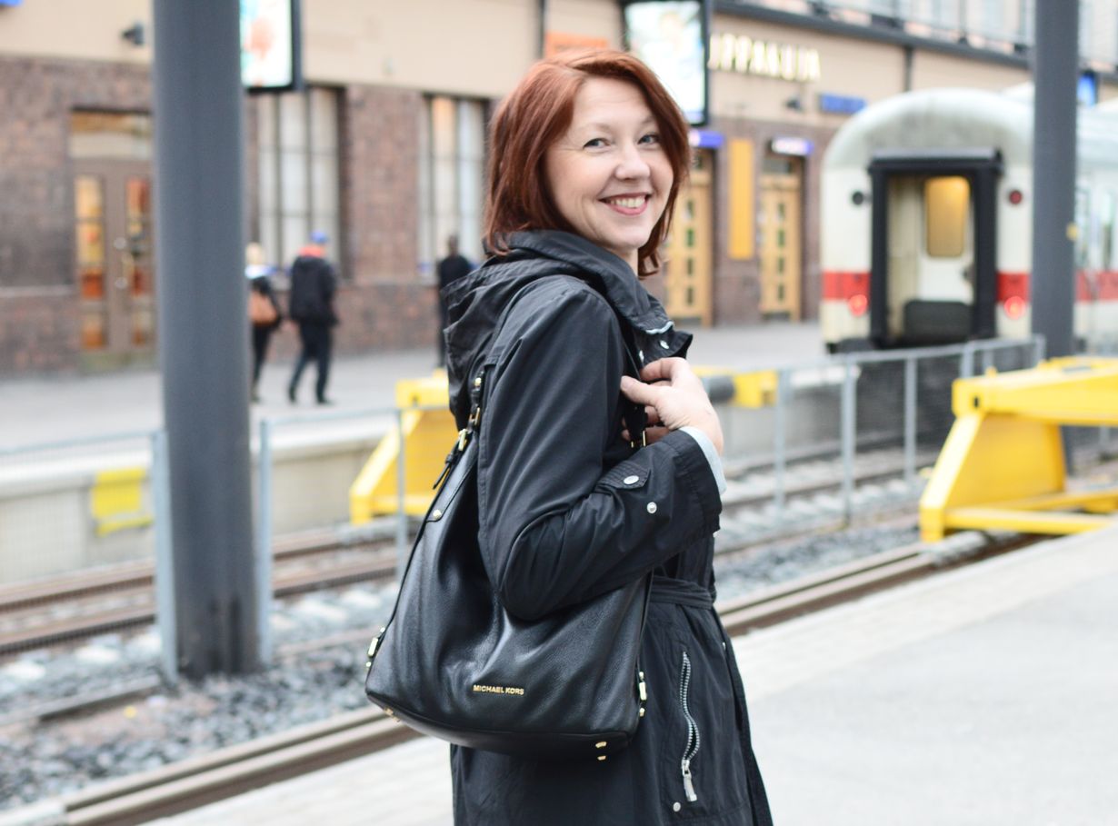 1. Vaatteiden täytyy olla käytännöllisiä, mutta tyylikkäitä. Niissä on oltava helppo liikkua kiireessä. Päälläni oleva Luhdan takki on ostettu Helsingin lentokentältä ja Michael Korsin laukku Oslon lentokentältä.