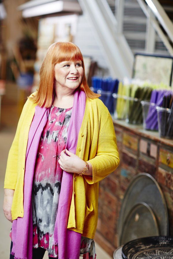 Raili on ihastunut suosikkiväriensä oranssin ja lilan yhdistelmään. Villaponcho 115 e, Marja Kurki. Trikootunika 20 e, KappAhl. Kaulakoru 59 e ja sormus 25 e,
