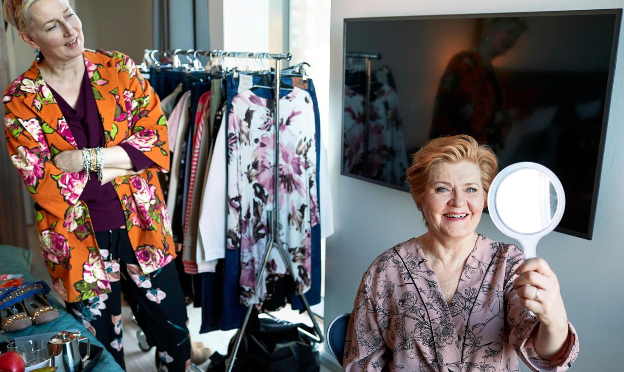 Espoolainen Sirkka-Liisa Malmivaara, 71, istuu meikkaaja Leena Waggonerin laitettavana tyynenä kuin silitettävä kissa. Kokeneen ammattilaisen kehut ovat nostaneet mielialaa: onpa kauniit hiukset, hyvät kulmat, silmän kestopigmentoitu rajauskin kohdallaan.
