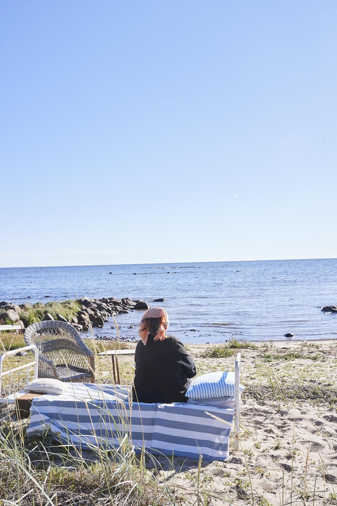 Marjatta tulee tänne yleensä kesäkuussa. Talvi on silloin väistynyt, mutta merituuli on edelleen kolea. Aamupesu hoituu silti meressä ja aurinkopaneeli antaa virtaa tietokoneelle.