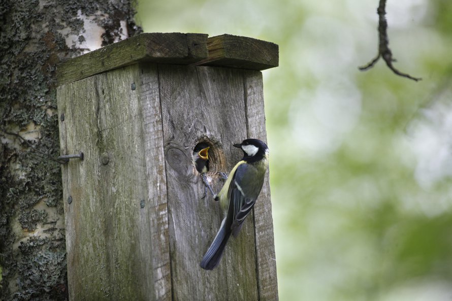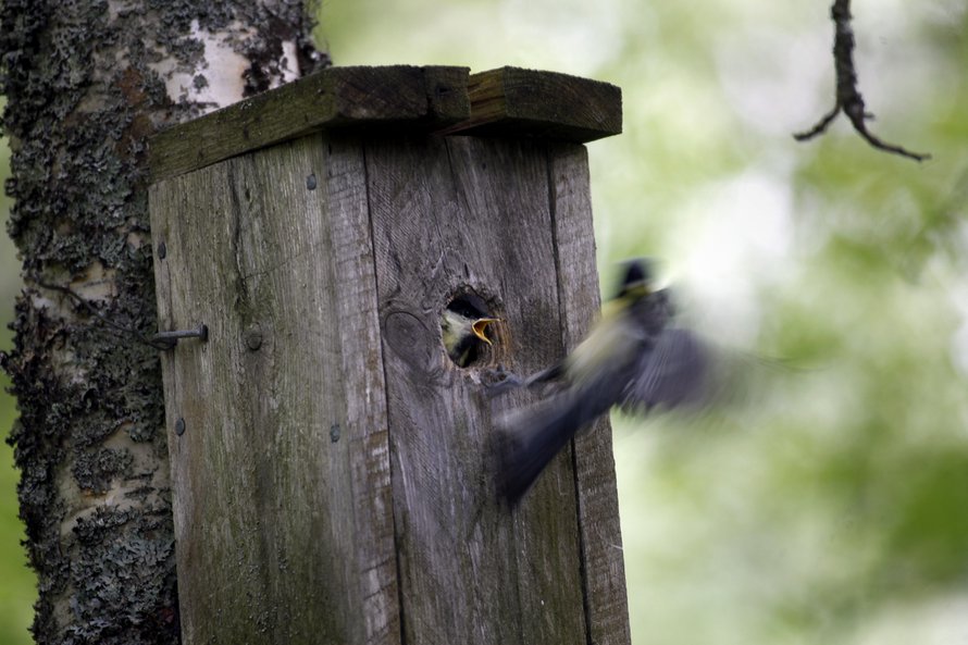Lintujen touhuja ja poikasten ruokintaa saa katsella monen linnunpöntön läheisyydessä. Näilläkin talitinteillä on jatkuva hoppu. Ei hetken lepoa. Poikaset huutavat lakkaamatta, että ruokaa, ruokaa. Mikä siinä onkin, että ne ovat nälkäisiä kaiken aikaa? Onneksi ihmislapsi on tyytyväinen, vaikka kukaan ei koko ajan ruokaa suuhun lapa.