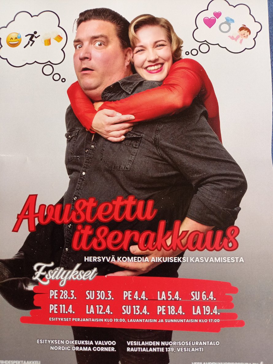 ”Hersyvä komedia aikuiseksi kasvamisesta”, lupaa ohjelmalehti. Kyllä, hauskaa on. Ja mikä parasta kaiken sisällä on elämän tosiasioita. Kenen toiveita täytän? Kenen ja mihin pyyntöihin on syytä suostua? Mistä omista toiveista on syytä pitää kiinni? Näytelmässä ilmeisesti itserakkaasta muitakin huomioivaksi aikuiseksi on kasvamassa päähenkilö, stand up koomikko Jari Kaula, jota esittää Harri Penttilä. Kyllä minusta välillä siellä muillakin on peiliin katsomista. Miten lienee esimerkiksi Kaulan tyttöystävä Seljalla (Tanja Järvinen)?
