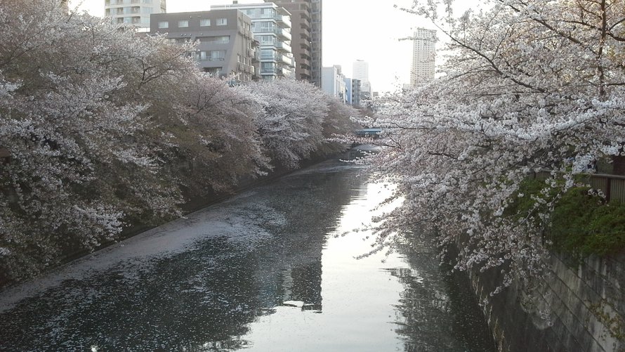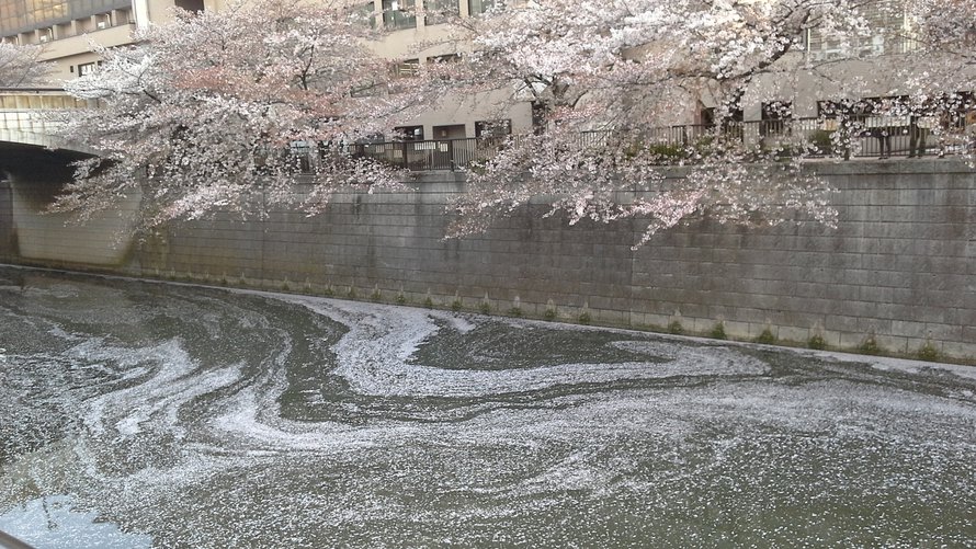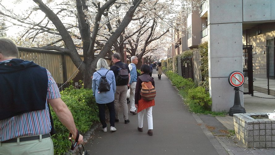 Lopulta pääsemme hotelliimme Princess Gardeniin yhden junanvaihdon kautta. Vaatteiden vaihto, hetki lepoa ja sitten japanilaiset ystävämme odottavatkin jo aulassa viedäkseen meidät tutustumaan Tokion kirsikankukka-aikaan. Kävelemme hotellin lähelle Meguro-joen varteen, se on yksi kuuluisimmista rantabulevardeista kirsikankukka-aikaan ja saamme vaeltaa kilometreittäin kirsikkapuiden alla. Kirsikan terälehdet peittävät joen pinnan ja joissakin kohden näyttää siltä kuin puut olisivat saaneet lumipeitteen.