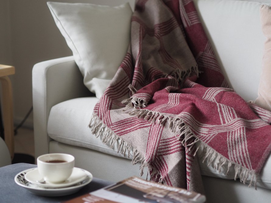 Nyt sain valita käyttööni Himmeli -huovan omassa mieleisessä värissä. Tätä huopaahan on myytävänä harmaan, beigen, terrakotan ja bordeaux'n värisenä, joista ilman muuta kaikki värit olisivat sopineet omaan makuuni ja kotiimme. Koska kodissamme on paljon neutraaleja värejä, päädyin ehdottomaan mieleisimpään syysväriini eli tuohon viininpunaiseen bordeaux -väriseen huopaan.