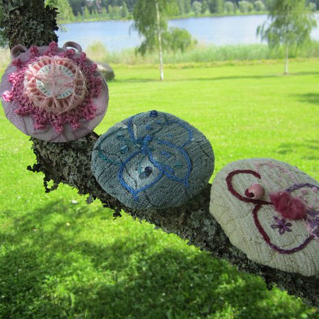 Niskatukiin Suvi-Maria on virkannut eri väriset suojat samalla mallilla. Kukkakoristeet on leikelty kirppisliinoista. Koko systeemi niskatukia lukuunottamatta on ommeltu käsin irtopäällisiin kiinni, joten ne saa tarpeen tullen myös pesuun.