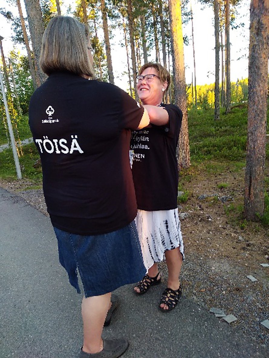 Pienen kylän suuri juhla toteutetaan pääosin talkootyönä. Selässä lukee suurin kirjaimin TÖISÄ. Tuija ja Aino-Leena selittivät, että jos selässä lukee töisä, se tarkoittaa, ettei saa palkkaa, palkkalaisille riittää ässiäkin kaksi. Mutta luulen kuitenkin, että kyse on Keski-Pohjanmaan murteesta.