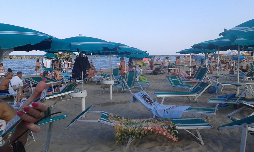 Ranta kuhisi italialaisia, jotka olivat tulleet lepäämään rauhassa merenrannalle. Vuokrattavia rantatuoleja ja aurinkovarjoja ei ollut enää yhden yhtäkään vapaana n.30-km.rantaviivan säteellä.