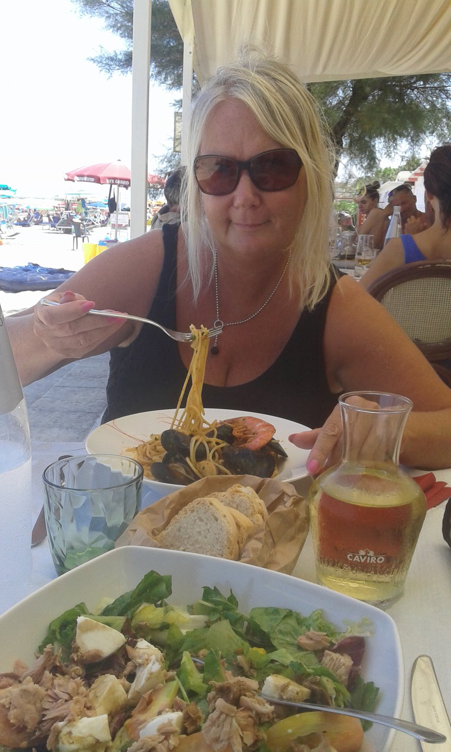 Tässä kohden onni kääntyi puolellemme ja noin 50-km.päästä löysimme Porto S.Giorgion ainoan parkkipaikan ja vielä rantakadulta. Saimme vuokrattua tuolit ja varjot ja vihdoin juoksin MM-juoksijan vauhdilla meren aaltoihin virkistymään. Sitten tukka märkänä rantaravintolaan.