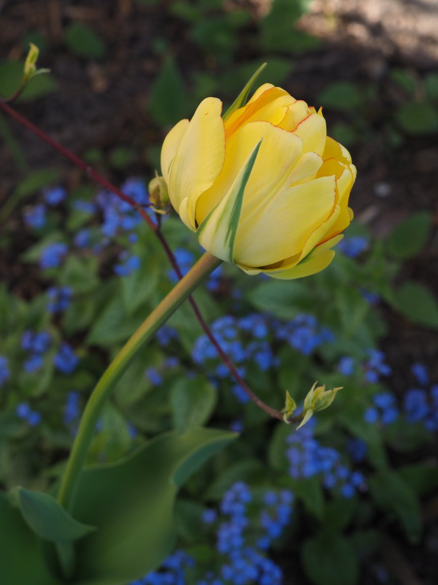 Myös toinen yllättäjä oli väriltään keltainen: varhainen, voimakkaasti kerrottu Yellow Pomponette, jota istutin narsissien seuraan uuden kirsikkaluumupuun alle. Pomponetten kukat olivat niin painavat, että varret taipuivat sateessa maahan asti. Olen välttänyt keltaisia tulppaaneja, mutta luulenpa, että nyt pääsin ennakkoluuloistani. Nämä ovat niin kauniita, raikkaita ja keväisiä. Pomponette sopii loistavasti yhteen samanvärisen ja samaan aikaan kukkivan narsissin, Golden Ducatin, kanssa. Tykkäsin kovasti.