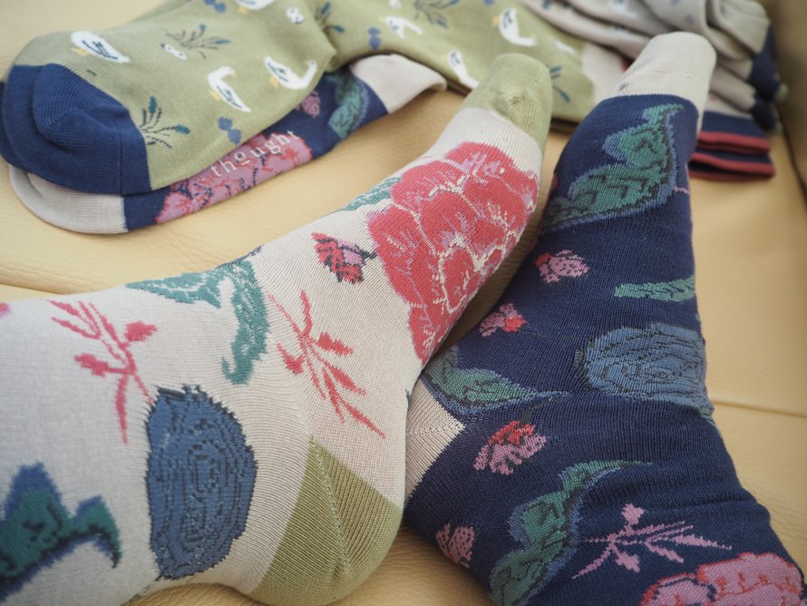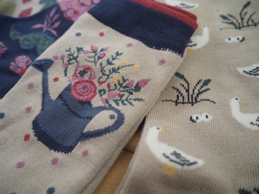 Olen ollut sukkien suhteen jo pidempään nirso. Minulle eivät ole vuosikymmeniin kelvanneet tavalliset, yksiväriset nilkkasukat. Vähintään raitoja tai pilkkuja on pitänyt olla. Ensimmäiset kukkasukkani löysin Gudrun Sjödeniltä, jolla on edelleen silloin tällöin valikoimassa kivoja jakardikuoseja. Ei ekopuuvillakaan huono materiaali ole, vaikka bambu on käytössä miellyttävämpi.
