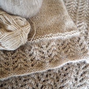 Kauneinta tässä mallissa ovat hihat, jotka ovat tavallista pidemmät ja päättyvät leveään pitsineulereunukseen. Koska minulla on lyhyet kädet, kudoin ensin toisen hihan valmiiksi, yhdistin sitten neuleen kappaleet ja sovitin hihat. Kuten arvelinkin, valmis hiha oli pari senttiä liian pitkä. Lisäksi se oli kyynärpään kohdalta turhan kapea. Purin hihan kuvioneuleeseen saakka ja kudoin uudestaan tekemällä lisäykset aikaisemmin, jolloin sain kappaleeseen lisää leveyttä. Toisen hihan tein samanlaiseksi. Purkaminen ei viivästyttänyt neuleen valmistumista kuin päivällä, koska hihan sileä neule oli nopea kutoa.