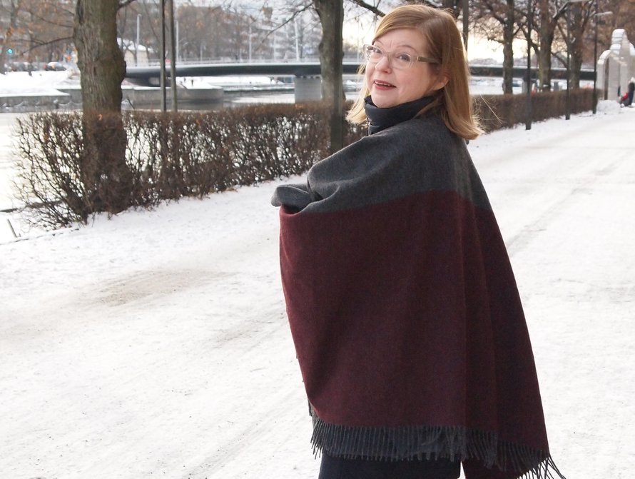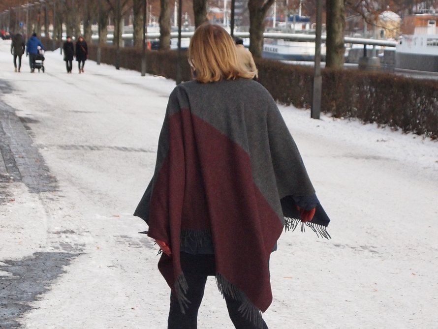 Päivän kuvat: viittani ei pysynyt kuvaustilanteessa kunnolla paikoillaan liukkaan takin päällä, mutta en minä tavallisesti pyörikään väkkärää kulkiessani. Nyt piti saada hapsut liehumaan.