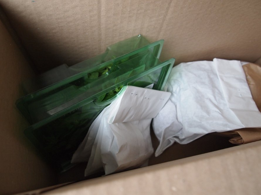 Taimet saapuivat hauskoissa, muovisissa ”minikasvihuoneissa” pienen, tarkasti muotoillun multapaakun kanssa. Paketti löytyi pakettiautomaatista ylösalaisin, vaikka siinä oli isot ja selvät vihreät nuolet osoittamassa, miten päin se pitäisi olla. Tokkopa taimet siitä suuremmin kärsivät, mutta jostakin ne kyllä kärsivät, sillä näin heti, että ainakin yksi niistä oli kuoleman kielissä. Yritin elvyttää niitä suihkuttamalla multapaakulle huoneenlämpöistä vettä.