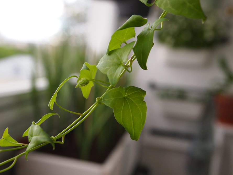 Sinivaulalla on kaunismuotoiset lehdet, eikö teistäkin? Sillä ei ole kärhiä, vaan se kiipeää kiepauttamalla lehden kannan kohteensa ympäri. Irrottelin taipuisat versot amppelin vaijereista ja  kannustin niitä mieluummin tarttumaan toisiinsa ja kääntymään alaspäin. Sainkin ne melko helposti kasvamaan toivottuun suuntaan.