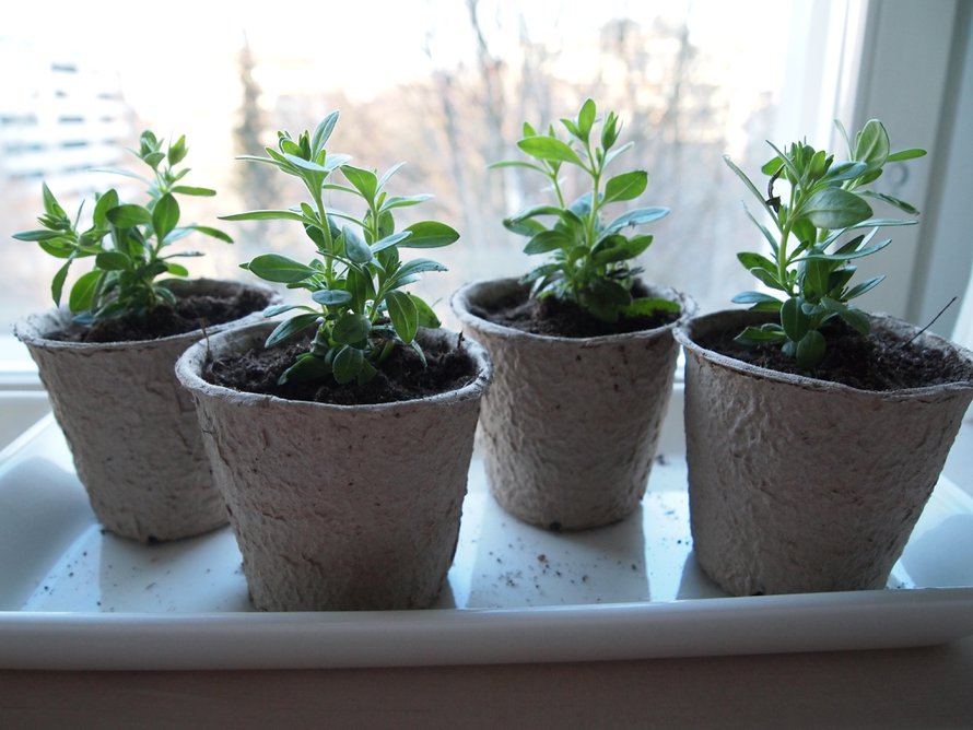 Mutta eihän se niin käynyt. Ohjeissa sanottiin, että pikkutaimet pitää istuttaa ensin 8 sentin ruukkuihin, koska isommassa ruukussa ne keskittyvät juurien kasvattamiseen eivätkä huolehdi riittävästi lehdistä ja nupuista. Sitä paitsi neljän tilaamani taimen lisäksi sain neljä tainta kaupan päälle. Siispä minulla oli tuplaongelma. Eikä kylvö-, taimi- tai kaktusmultaa, vaan ainoastaan kesäkukkamultaa.