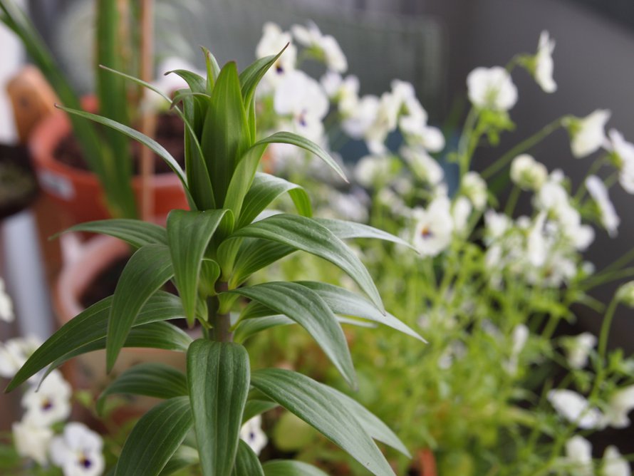 Tämän kuvan oikeassa alakulmassa kyhjöttää kielo, joka selviytyi talvesta kellarissa, muttei ole kukkinut ollenkaan. Se on kylläkin yrittänyt levittäytyä tekemällä pari sivuversoa. Ruukun reunat tulivat kuitenkin vastaan, eivätkä versot ole kasvaneet täyteen mittaan.