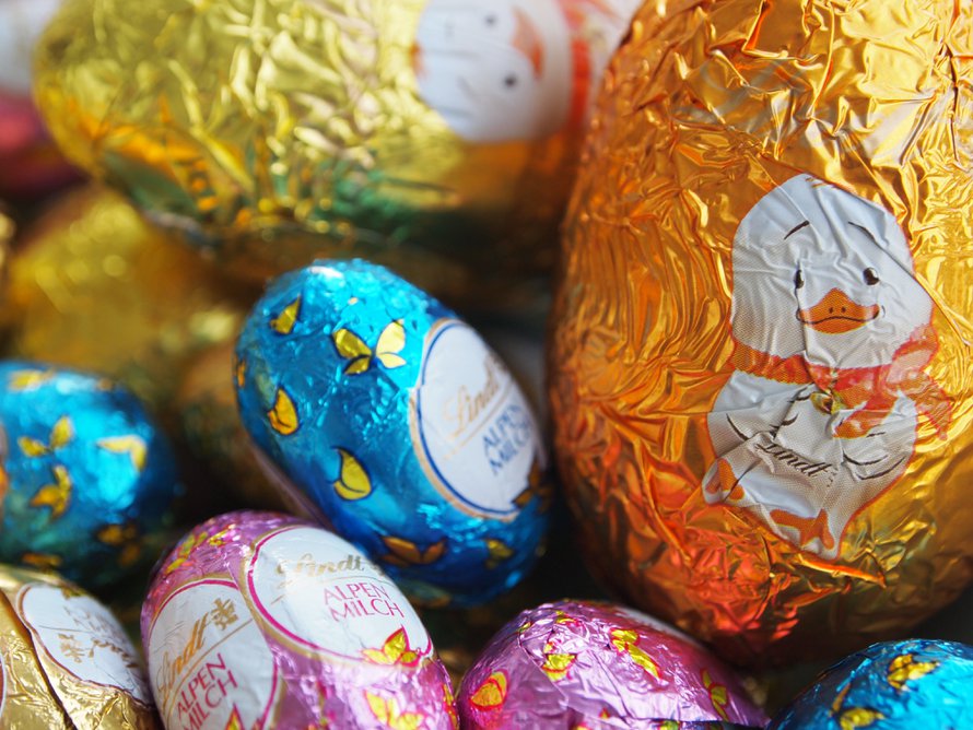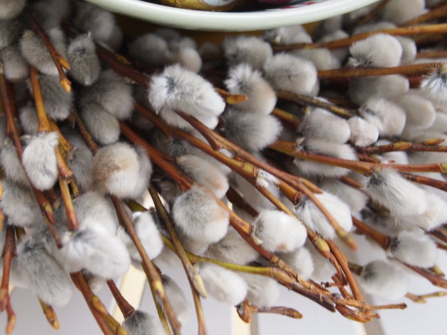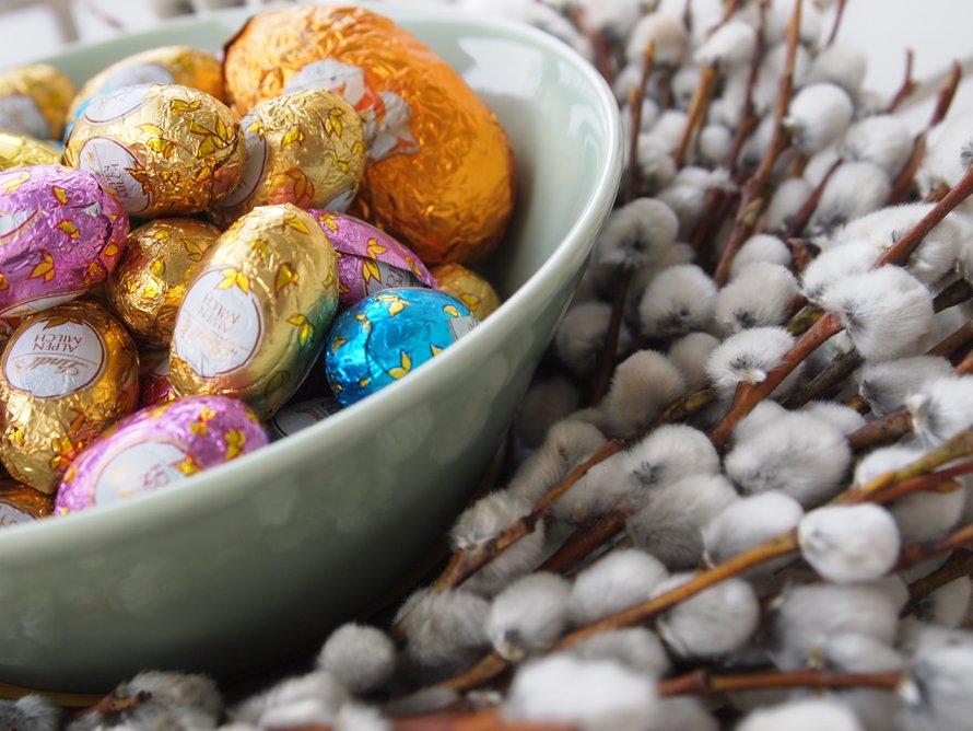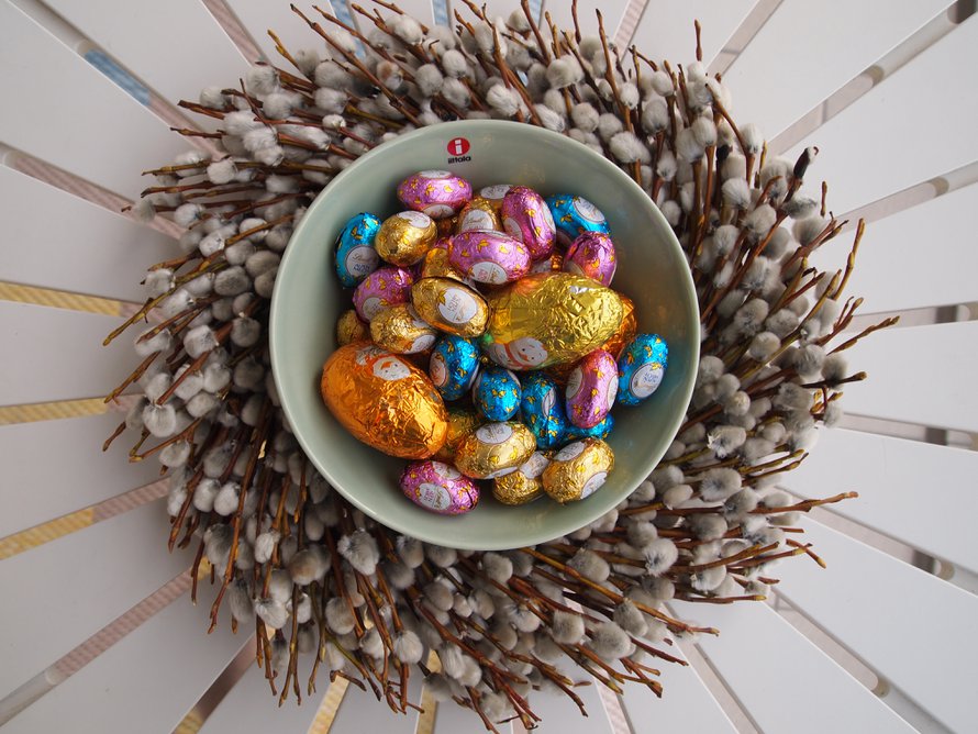 Päivän kuvat: Celadoninvihreä murokuppi on täytetty Lindtin suklaamunilla. Pienemmät ovat täyttä maitosuklaata, isommissa on valkosuklaatäyte. Pajunkissakranssi on hankittu Turun torilta.