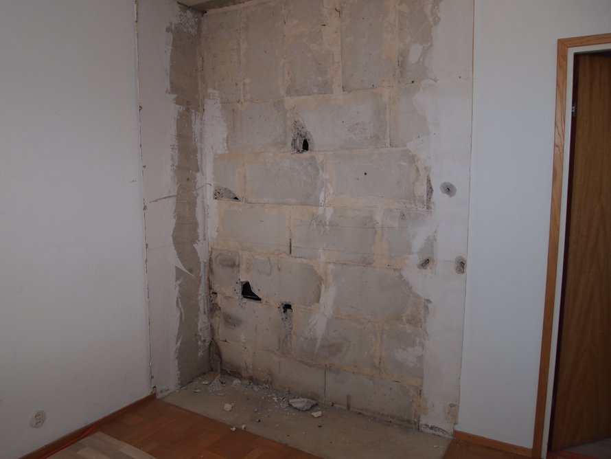 Suurin muutos oli näkyvissä jo ensimmäisen remppaviikon jälkeen: kylpyhuone oli purettu lattiaa lukuunottamatta. Myös viereisen makuuhuoneen kaapisto oli purettu ja kuljetettu pois. Kaapiston takaa paljastui isoista harkoista muurattu seinä. Seinä oli muutamassa kohdassa lohjennut niin, että makuuhuoneesta pääsi hiukan valoa kylpyhuoneeseen.