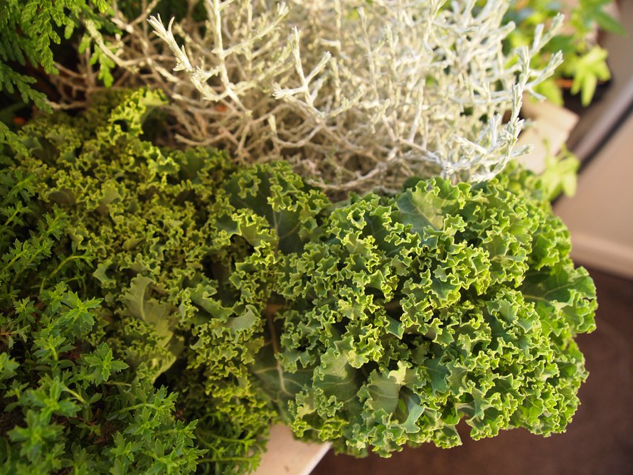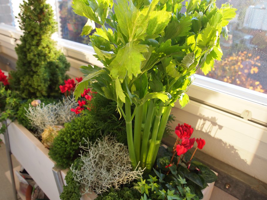 Hupailin hieman syksyn viimeisen satolaatikon kanssa ja kuvasin sen antimia viljelylaatikossa koristekasvieni joukossa. Varsiselleri näytti paikalleen kylvetyltä, ja valkosipuli koristi green boy-mätästä kuin rossi leskiäidin rintaa.