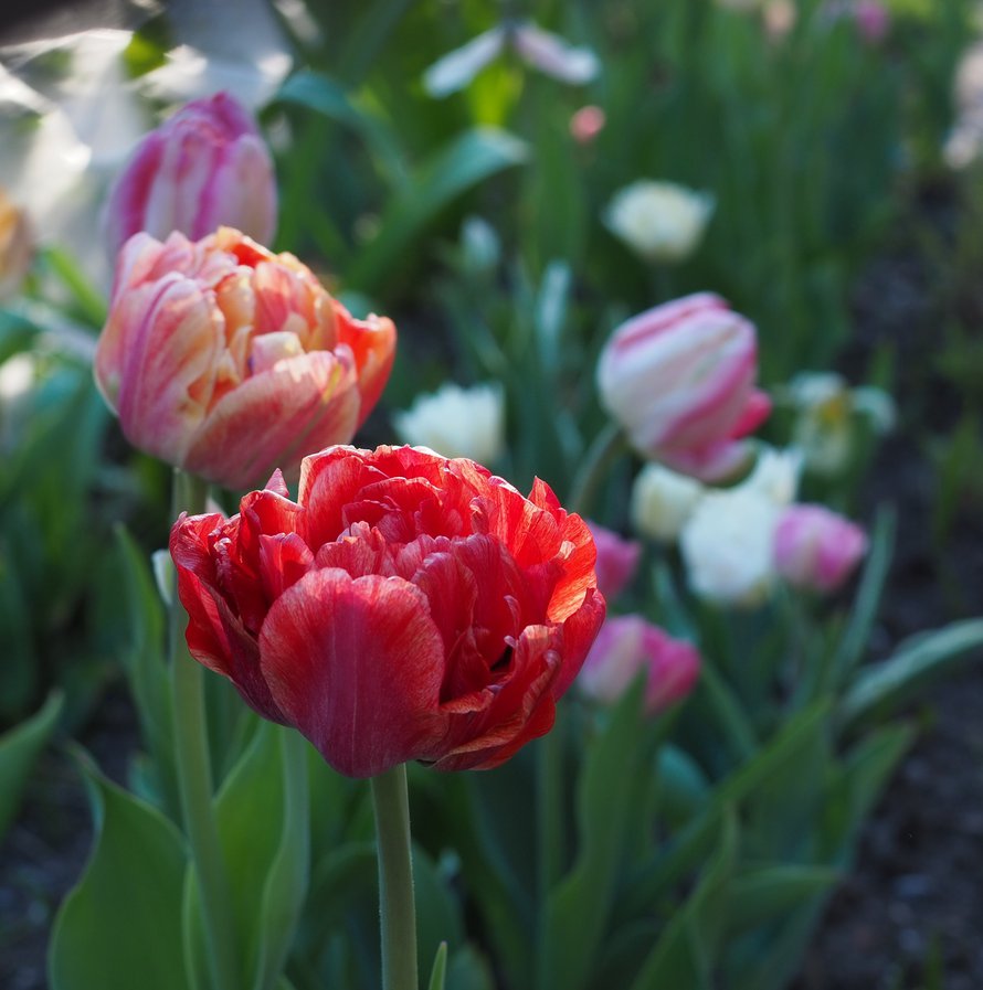 Kukkia tuli kyllä penkin muihin osiin, mutta moni lajike jäi matalaksi ja/tai väreiltään kovin vaaleaksi. Vaaleanpunainen Angelique oli nuppuna kokovalkoinen ja sai ripauksen väriä vasta täysin auenneena. Lisäksi moni upea lajike tuotti hiirituhojen johdosta vain yhden tai kaksi kukkaa. Jyrsijöiden suosiossa olivat erityisesti Peptalk, Valdivia ja Finola. Vain China Town ei niille juuri kelvannut. Se oli selvästi kaikkia muita lajikkeita myöhäisempi ja alkoi näyttää hyvältä vasta, kun muut olivat jo kuihtuneet.