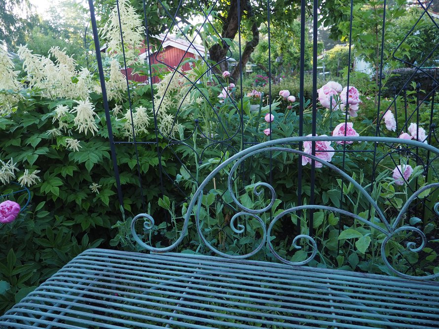 Katselin inspiraatioksi yökaudet puutarhakuvia. Kenties puutarhakeinu tai sittenkin pieni istuinryhmä? Eihän sitä olisi pakko käyttää. Tukholman puutarhamessujen kuvissa näkyi karkkivärisiä metallisia puutarhakalusteita. Aika kivoja. Kun sitten Facbook toi näytölleni mainoksen koristeellisista metallikalusteista, aika oli kypsä. Antiikinvihreä rautadivaani! Näin heti mielessäni, miten krassit ja muratit kiipeilisivät sen käsi- ja selkänojalla. Myös penkin alla kasvaisi kukkia, jotka kurottaisivat sen läpi.