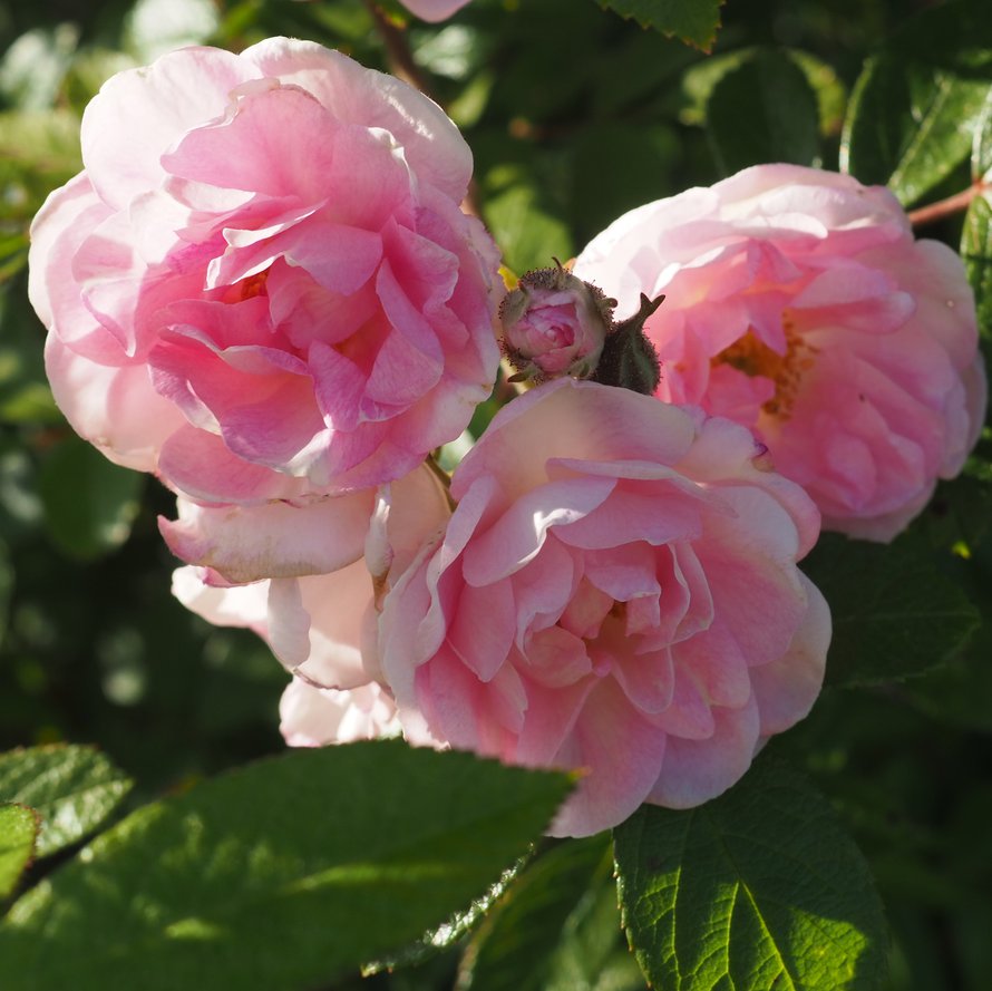 OmaKassu-pihasuunnitelmassa, jonka olin tilannut Puutarha Auringontähdeltä, ehdotettiin punalehtiruusua. Halusin kuitenkin jotakin hempeämpää ja lisäksi vierastin perinteisimpiä lajikkeita, koska ne kukkivat niin lyhyesti. Laskeskelin, että alueelle mahtuisi kolme pienehköä pensasruusua. Mieluiten eri lajikkeita, koska tykkään vaihtelusta.