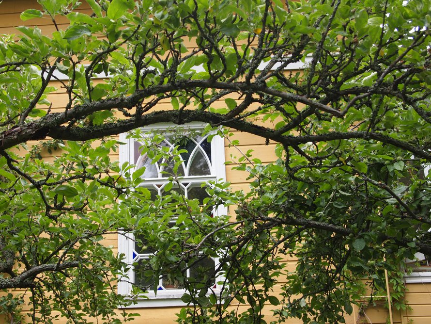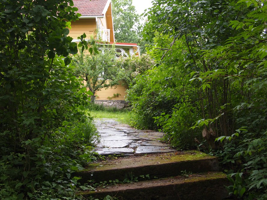 Tutkin puutarhaa sen verran kuin kehtasin. Löysin leveän, sammaloituneen portaikon, joka vei rantaan päin, mutta päättyi heinikkoon. Sitä pitkin jalosukuinen herrasväki oli varmaan saapunut laiturilta huvilaan. Mitähän kivisissä kukkauurnissa silloin kasvoi?