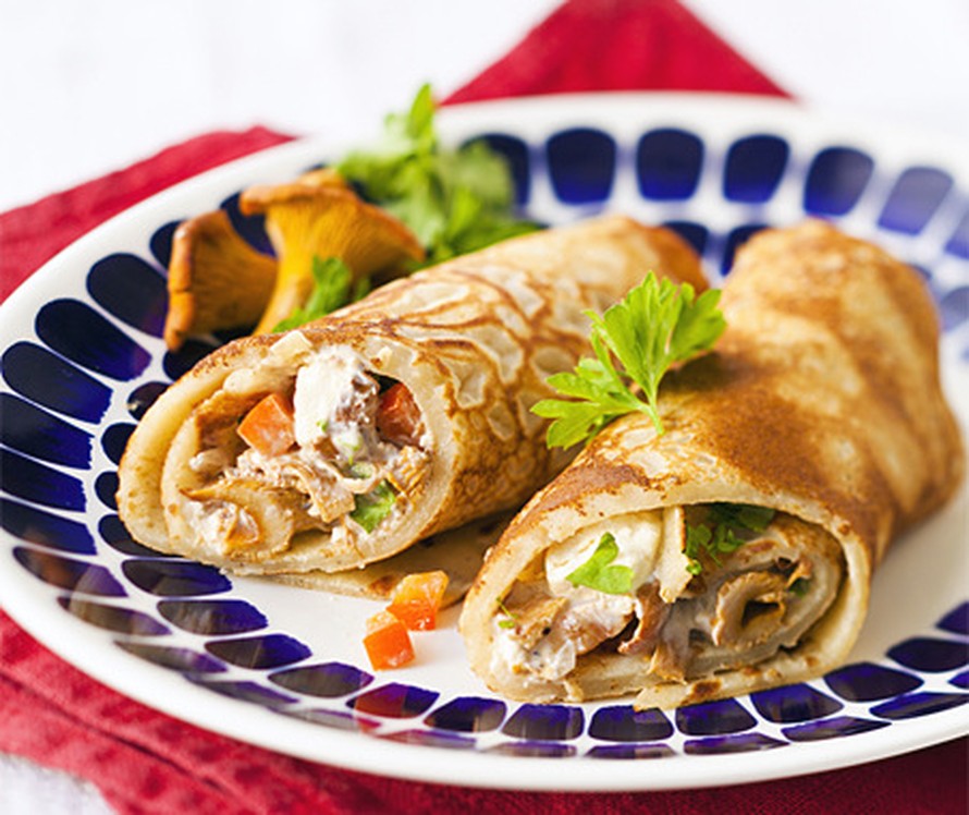 Nosta täytettä räiskäleelle. Taita kahtia tai kierrä rullalle