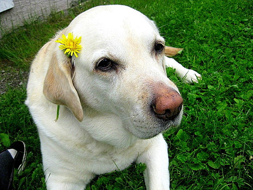 Nelli-koiramme sai voikukan korvansa taakse päivää puutarhassa paistatellessaan.