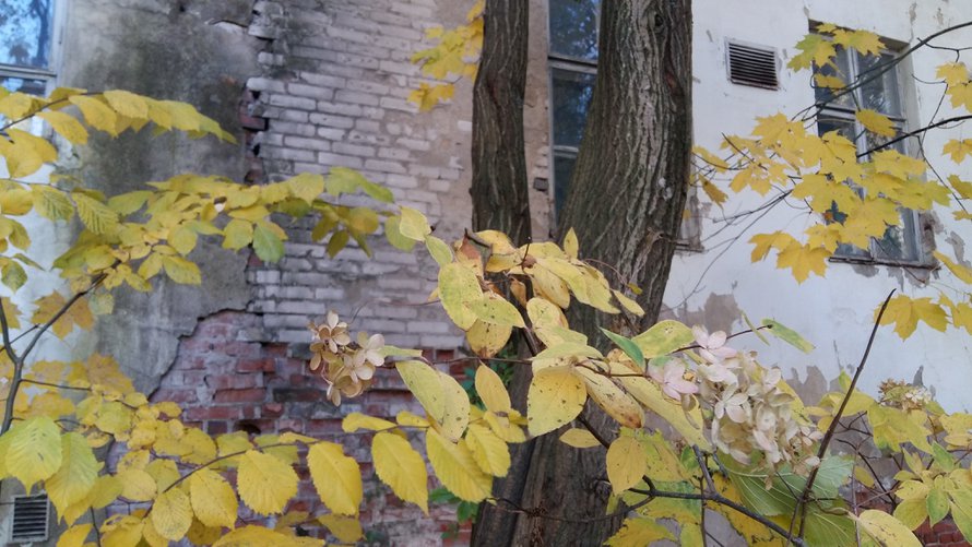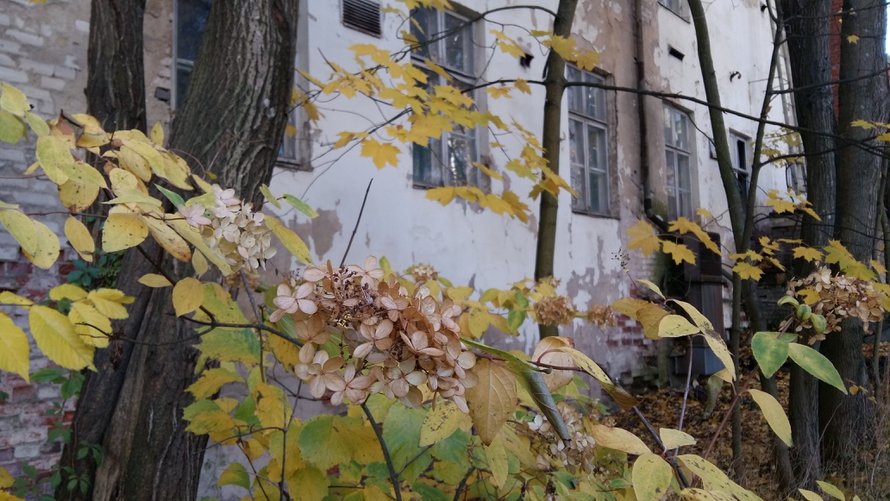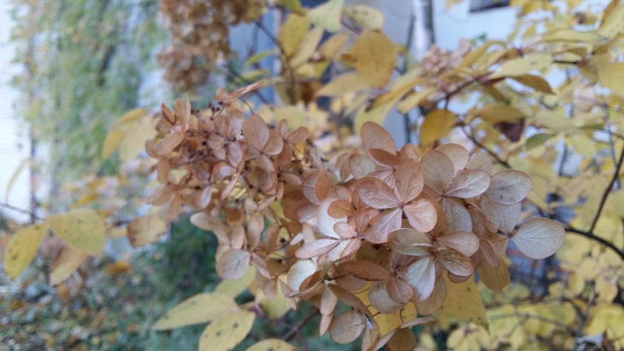 Päivän kuvat: Hortensioita takapihalla. Taustalla naapurin purkutalo.