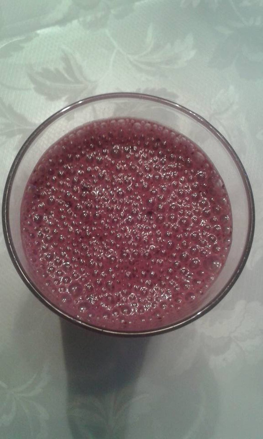 Siihen laitan 5-10 dl mantelimaitoa, "kouralliset" mansikkaa ja toinen mustikkaa, 10 kuorittua mantelia, 1 banaani makeudeksi, purkki maitorahkaa, 2-3 rkl kauralesettä tai pellavarouhetta ja kaikki vaan sekaisin sauvasekoittamella. Määrästä riittää lasillinen kahdelle pariksi-, kolmeksi päiväksi.