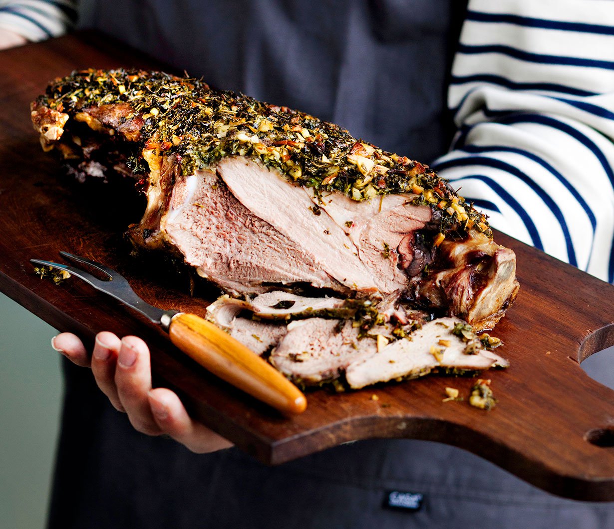Yrtti-valkosipulivoilla silattu karitsanviulu maistuu taivaalliselta muhittuaan pitkään uunin lempeässä lämmössä.