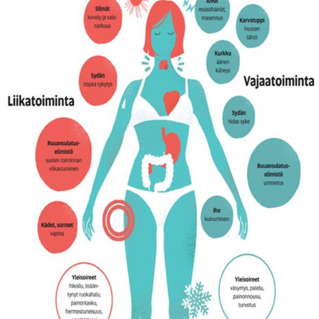 "Minulla oli ollut vuosien ajan epämääräisiä oireita, mutta keväällä 2014 en pystynyt enää ohittamaan niitä. Olin kova liikkumaan ja nautin juoksusta ja kuntosalitreenistä, mutta nyt rappusten nousukin vei voimat. Olin hurjan väsynyt, paino nousi ja silmiä särki. Oli vapinaa ja sydämentykytystä, korvat soivat, ääni painui matalaksi, iho hilseili ja hiuksia irtosi tavallista enemmän.