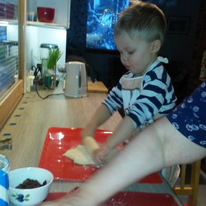 Pöydän ympärillä oli pieniä pestyjä käsiä odottamassa omaa osuuttaan tarkoin varjellusta taikinasta. Pienet kaulimet piirsivät ilmaa, kun penkillä kävi olo ahtaaksi. Metallinen possumuotti vaihtoi mallia, kun kaksi leipuria ehätti tarttumaan siihen yhtä aikaa eikä kumpikaan halunnut olla toinen.